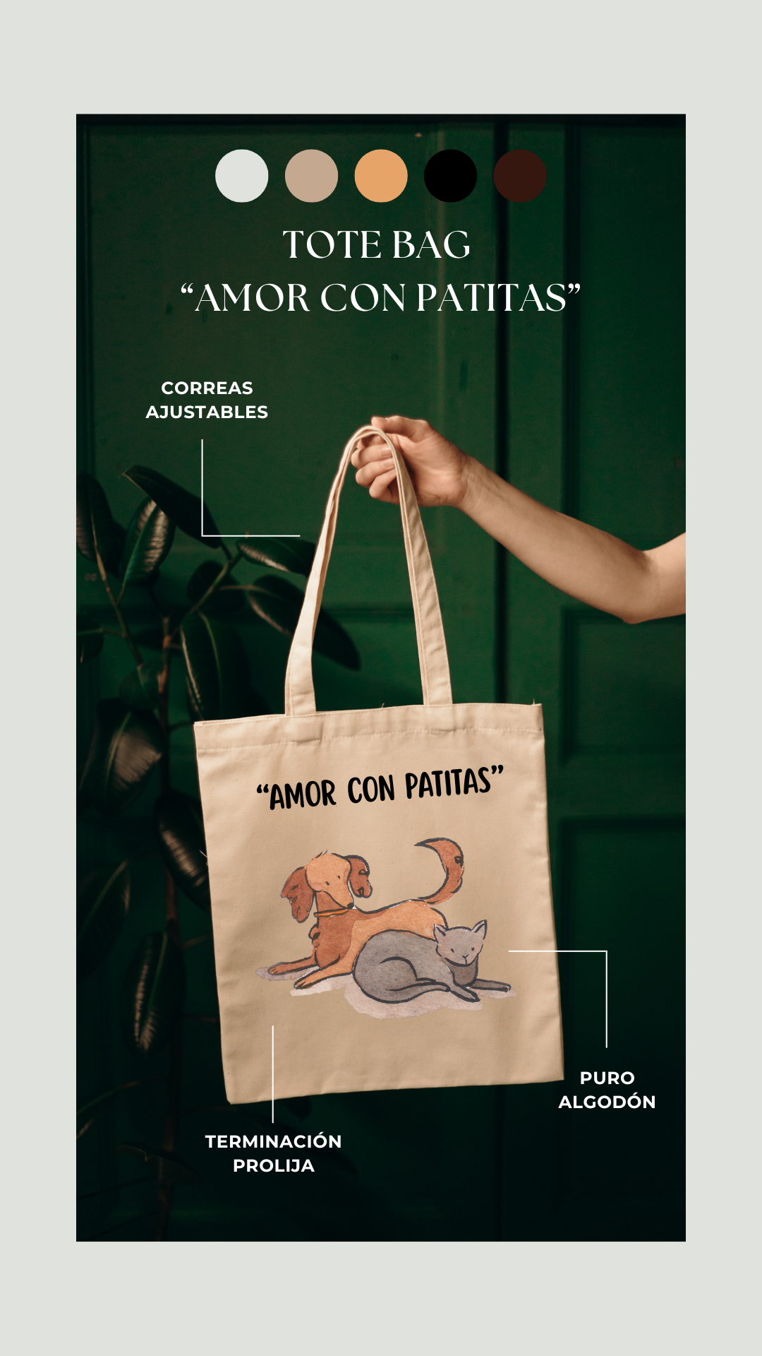 Nuestra tote bag “Amor con Patitas” está elaborada con lona ecológica de alta resistencia, pensada para acompañarte en tu día a día mientras compartes un mensaje poderoso: rescatar transforma vidas. Su diseño combina una tipografía suave con una ilustración de huellitas que simbolizan a cada perrito y gatito que ha sido abrazado por una segunda oportunidad.